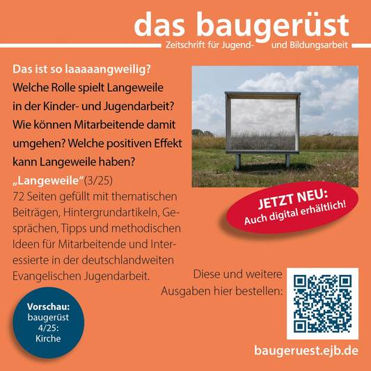 Langeweile – Welche Rolle spielt Langeweile in der Kinder- und Jugendarbeit? Lesen Sie in der aktuellen Ausgabe des „baugerüsts“ nach: Spannende, thematische Artikel, Diskussionen und Praxistipps rund um dieses aktuelle Thema. Sie können das Heft für € 7,- als Einzelheft bestellen. Das „baugerüst“ erscheint viermal pro Jahr und ist für € 21,- auch als Abo erhältlich.